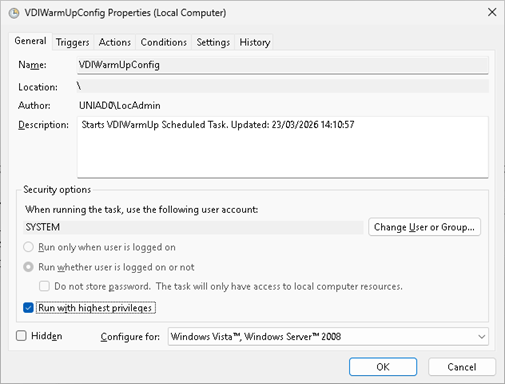 The VDIWarmUpConfig scheduled task runs as SYSTEM. It updates the VDIWarmup scheduled task, then starts the VDIWarmup scheduled task.