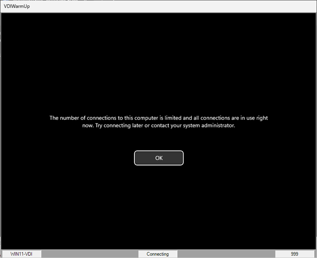 Run VDIWarmUp.exe /test (as Administrator) to launch an RDP Connection, create the VDIWarmUp user profile and validate your configuration.