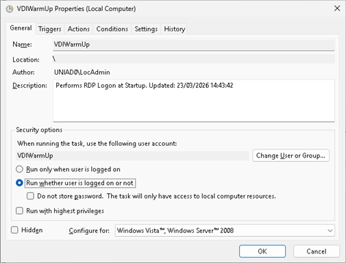 Events from the VDIWarmUpConfig scheduled task are logged to C:\Windows\Temp\VDIWarmUp-SYSTEM.log