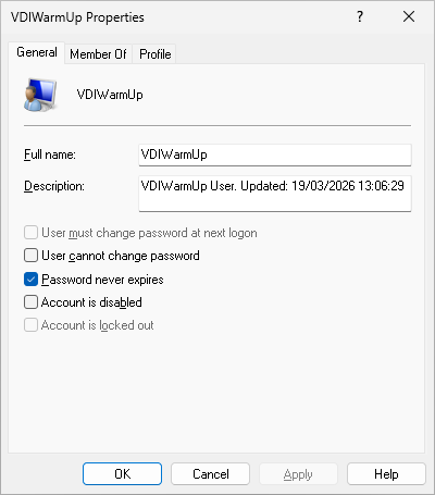 Updates VDIWarmUp user and VDIWarmUp Scheduled Task. Connects via RDP and respects all configured parameters.