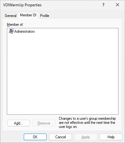To prevent logon issues with User Profile Management, ensure that VDIWarmUp or members of Administrators are excluded from User Profile Management.