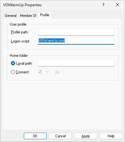 The profile logon script (VDIWarmUp.cmd) is located inC:\Windows\System32\Repl\Import\Scripts