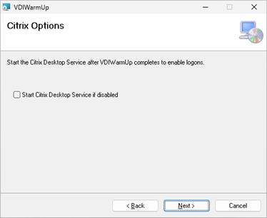 If using Citrix PVS or MCS, you can disable the Citrix Desktop Service in the Master Image to prevent connections while VDIWarmUp is running. VDIWarmUp can enable and start the service when complete, enabling Citrix logons.