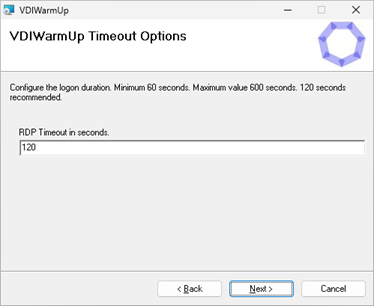 ModifyVDIWarmUp.cmdbased on your application environment. It is recommeded to retain the shutdown /l command for a faster log off, instead of waiting for the session duration (RDPTIMEOUT)to expire.